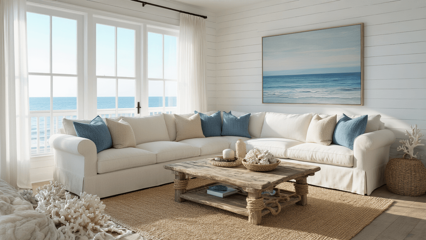 A sunlit coastal living room featuring an ivory L-shaped sectional, a weathered driftwood coffee table, and large ocean horizon artwork, with floor-to-ceiling windows, exposed beams, and decorative accents, all in a photorealistic style.