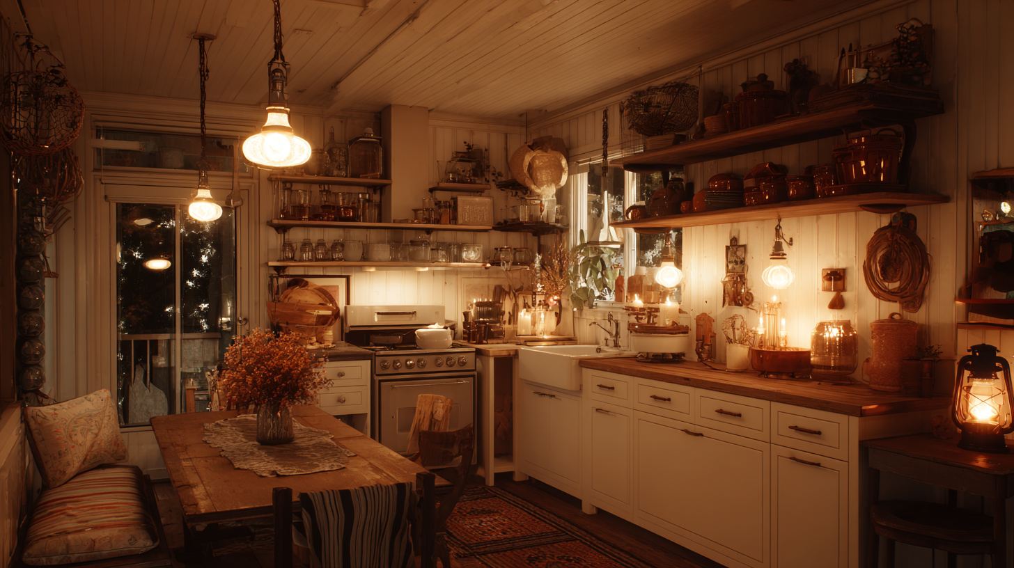 Add vintage inspired lighting to make a Tiny Cottage Kitchen feel warm magical and full of character. Small pendants schoolhouse lights brass sconces and milk glass fixtures can brighten the room beautifully. Upgrade one light today and enjoy the glow.